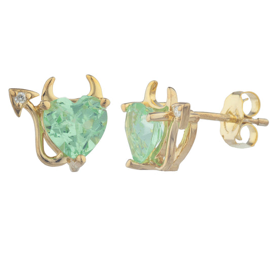 14Kt Gold Green Sapphire & Diamond Devil Heart Stud Earrings