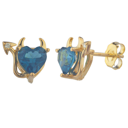 14Kt Gold London Blue Topaz & Diamond Devil Heart Stud Earrings