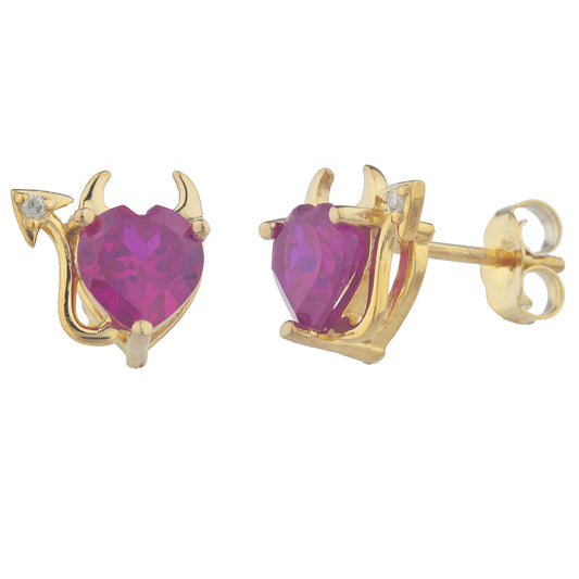 14Kt Gold Created Ruby & Diamond Devil Heart Stud Earrings