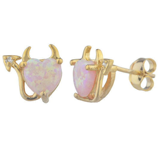 14Kt Gold Pink Opal & Diamond Devil Heart Stud Earrings