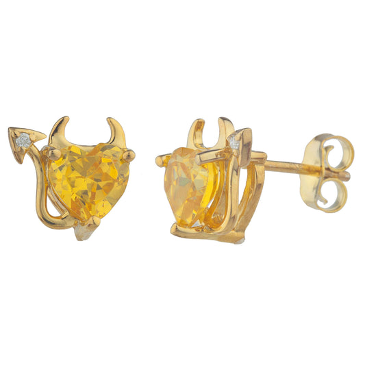 14Kt Gold Yellow Citrine & Diamond Devil Heart Stud Earrings