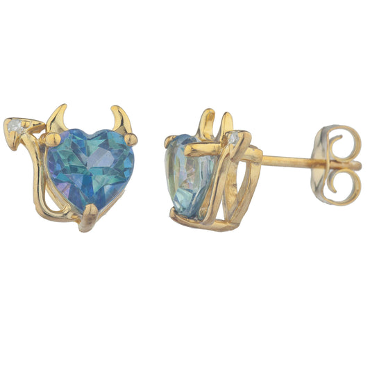 14Kt Gold Natural Blue Mystic Topaz & Diamond Devil Heart Stud Earrings