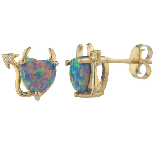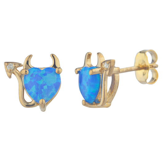 14Kt Gold Blue Opal & Diamond Devil Heart Stud Earrings