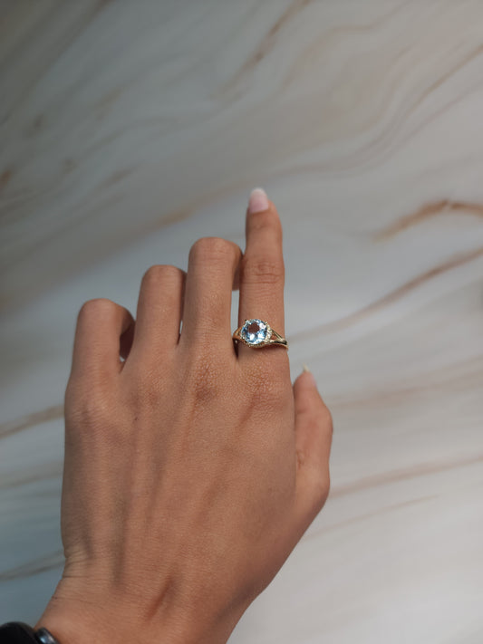 14Kt Gold 2 Ct Genuine Aquamarine & Diamond Halo Design Round Ring