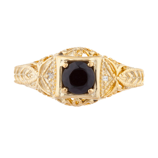 14Kt Gold Genuine Black Onyx & Diamond Design Round Ring