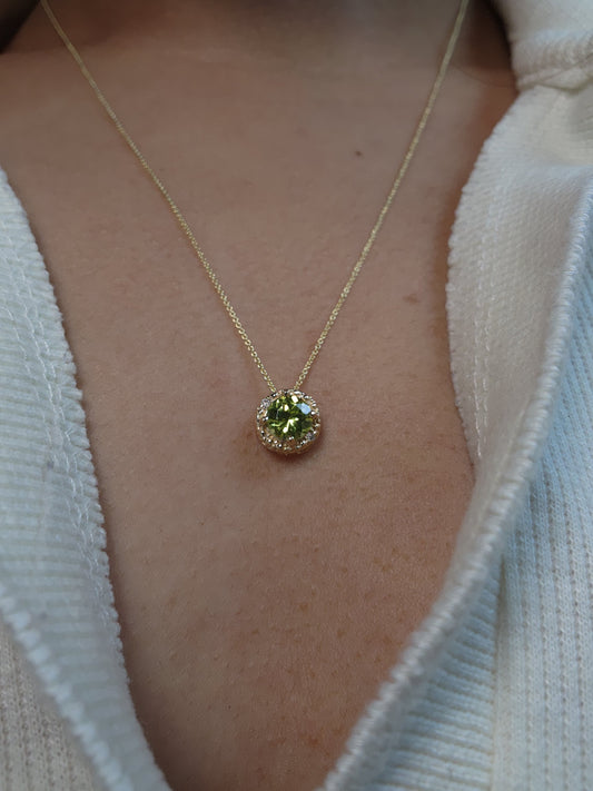 14Kt Gold 0.50 Ct Peridot Halo Design Pendant Necklace
