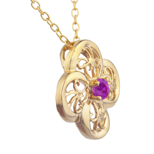 14Kt Gold Created Ruby Clover Design Pendant Necklace