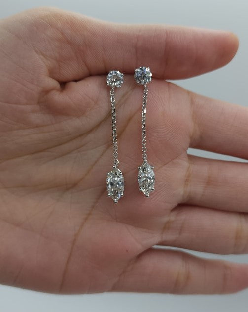 14Kt Gold 3 Ct Lab Grown 2 Stone Marquise Shape & Round Diamond Dangle Studs Earrings