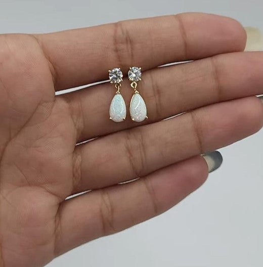 14Kt Gold Created Opal & Lab Grown Diamond Teardrop Dangle Stud Earrings