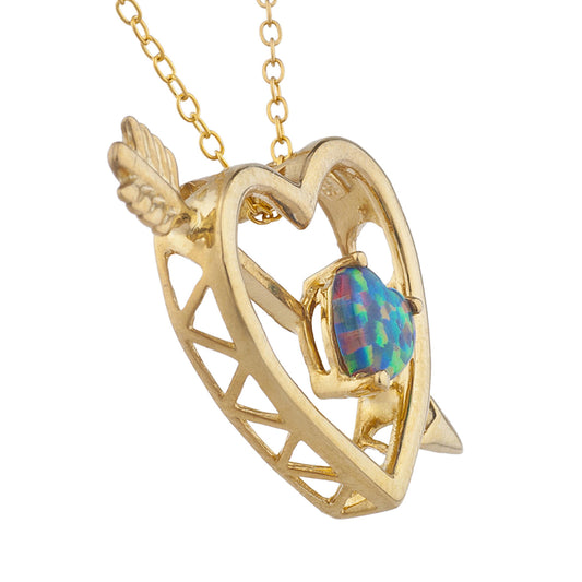 14Kt Gold Blue Opal Heart Bow & Arrow Pendant Necklace