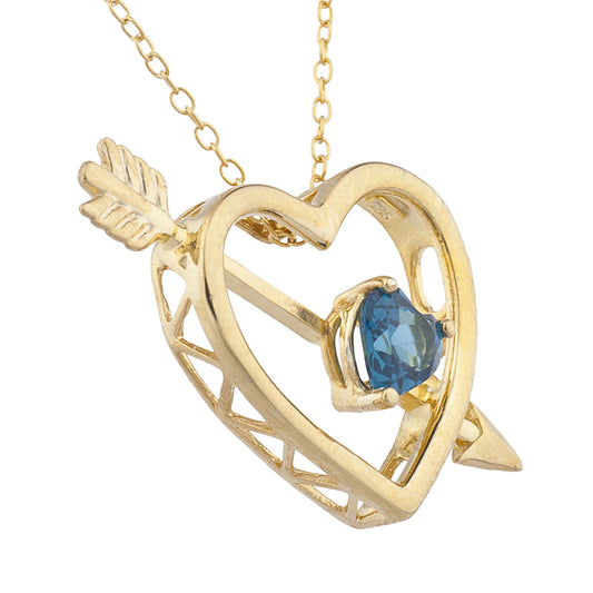 14Kt Gold Blue Topaz Heart Bow & Arrow Pendant Necklace