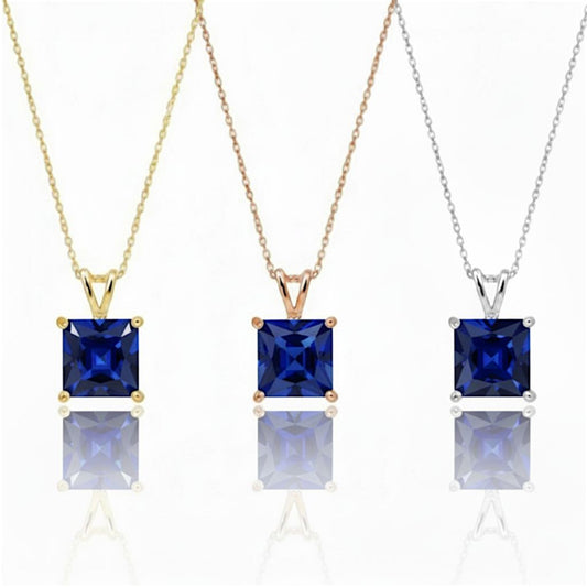 14Kt Gold Blue Sapphire Princess Cut Pendant Necklace