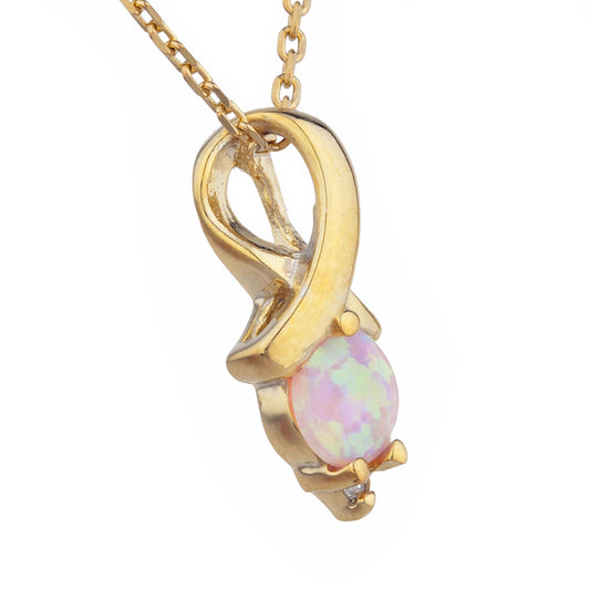 14Kt Gold Pink Opal & Diamond Round Design Pendant Necklace