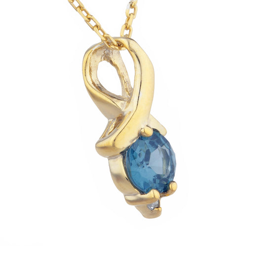 14Kt Gold London Blue Topaz & Diamond Round Design Pendant Necklace