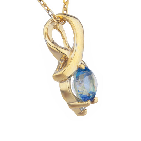 14Kt Gold Natural Blue Mystic Topaz & Diamond Round Design Pendant Necklace