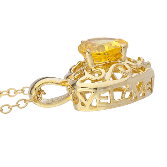 14Kt Gold Yellow Citrine & Diamond Heart LOVE ENGRAVED Pendant Necklace