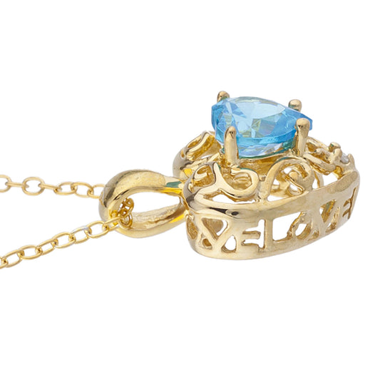 14Kt Gold Swiss Blue Topaz & Diamond Heart LOVE ENGRAVED Pendant Necklace
