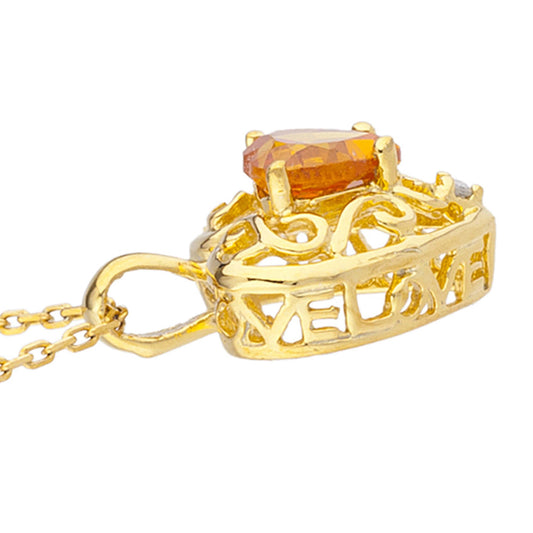 14Kt Gold Orange Citrine & Diamond Heart LOVE ENGRAVED Pendant Necklace