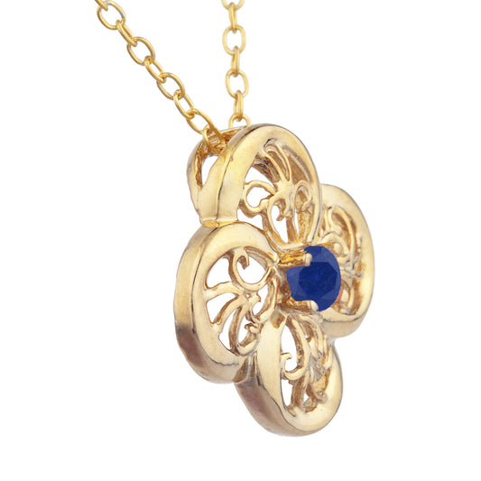 14Kt Gold Blue Sapphire Clover Design Pendant Necklace
