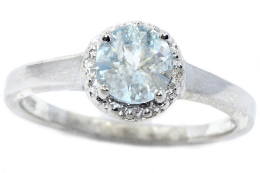 14Kt White Gold Genuine Aquamarine & Diamond Round Ring