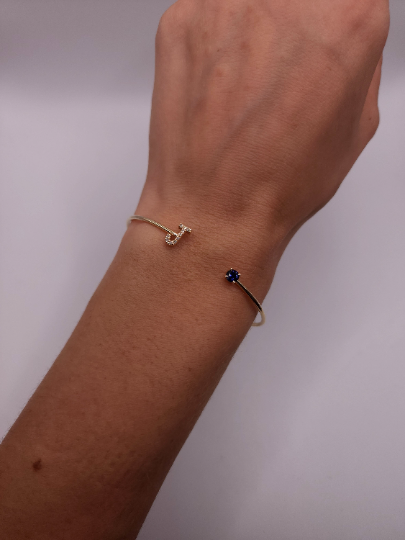 14Kt Gold Blue Sapphire & Diamond Initial Letter Bangle Bracelet
