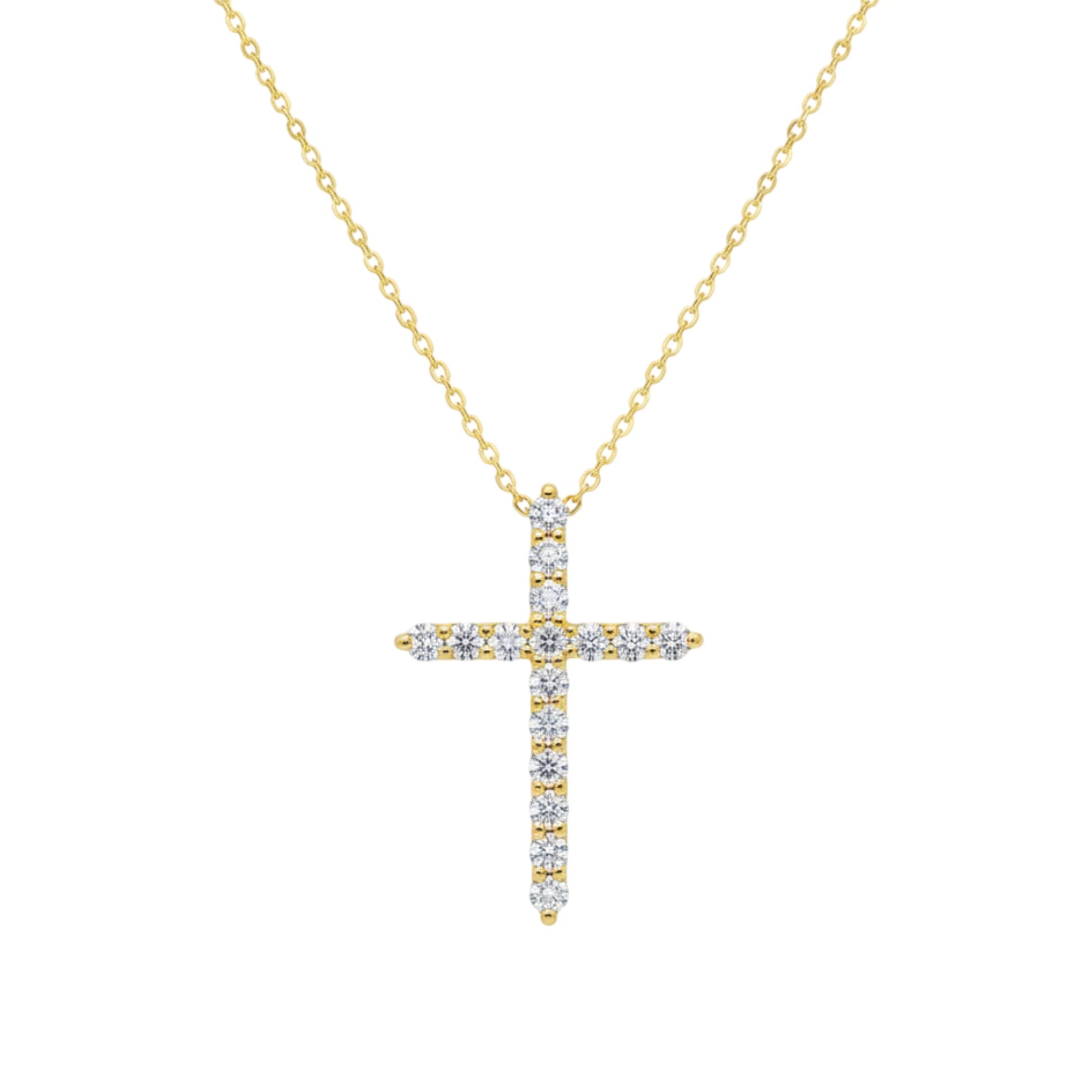 This is a beautiful cross pendant set with real natural diamonds. The diamonds are high quality and the chain is strong. It is set in real solid 14Kt Gold and the chain is 14Kt Gold as well. You can choose if you want 14Kt White Gold, 14Kt Yellow Gold or 14Kt Rose Gold.