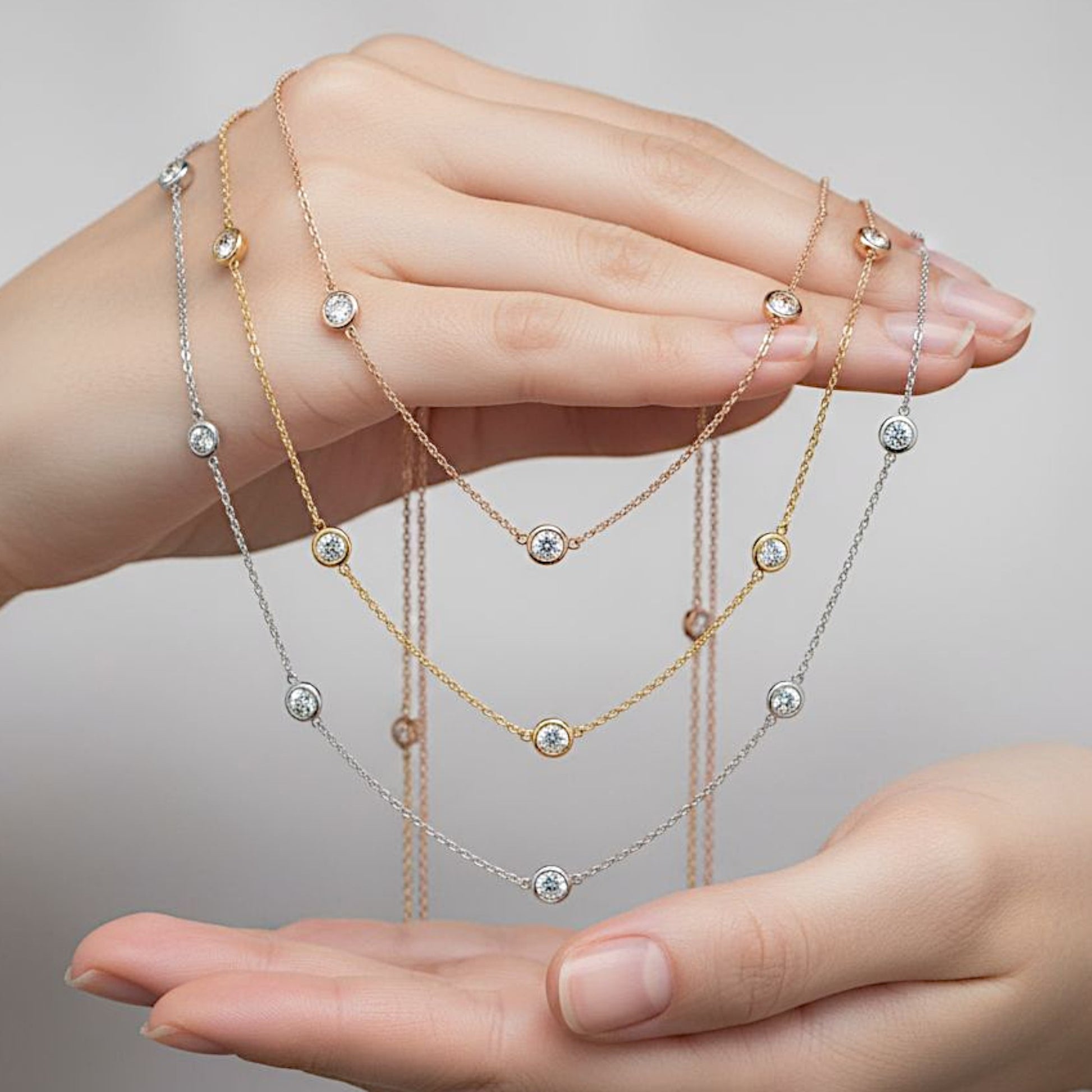 This is a beautiful diamond by the yard necklace. It has 5 diamonds set in real solid 14Kt Gold. You can choose if you want 14Kt White Gold, 14Kt Yellow Gold or 14Kt Rose Gold.