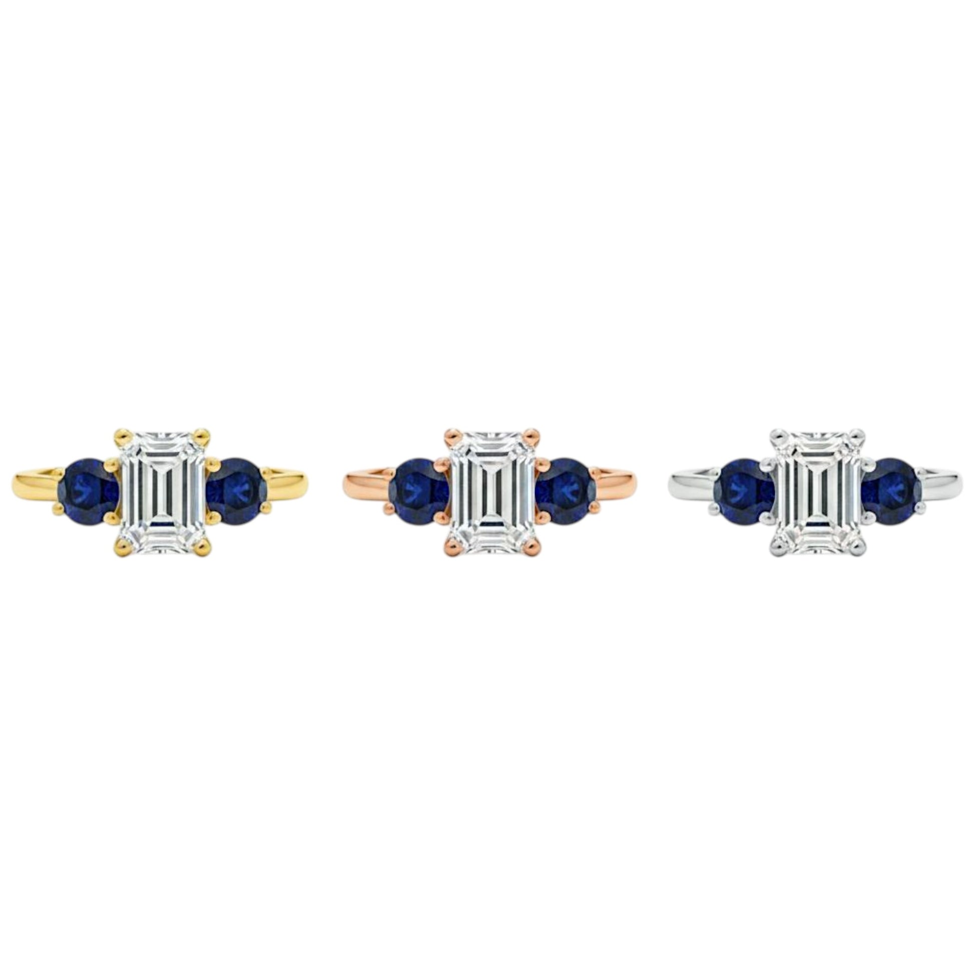 14Kt Gold 1.60 Ct Emerald Cut and Blue Sapphire 3 Stone Lab Grown Diamond Ring