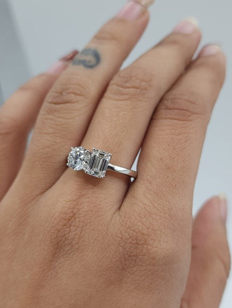 14Kt Gold 1.90 Ct Lab Grown Diamond Emerald Cut & Round 2 Stone Ring