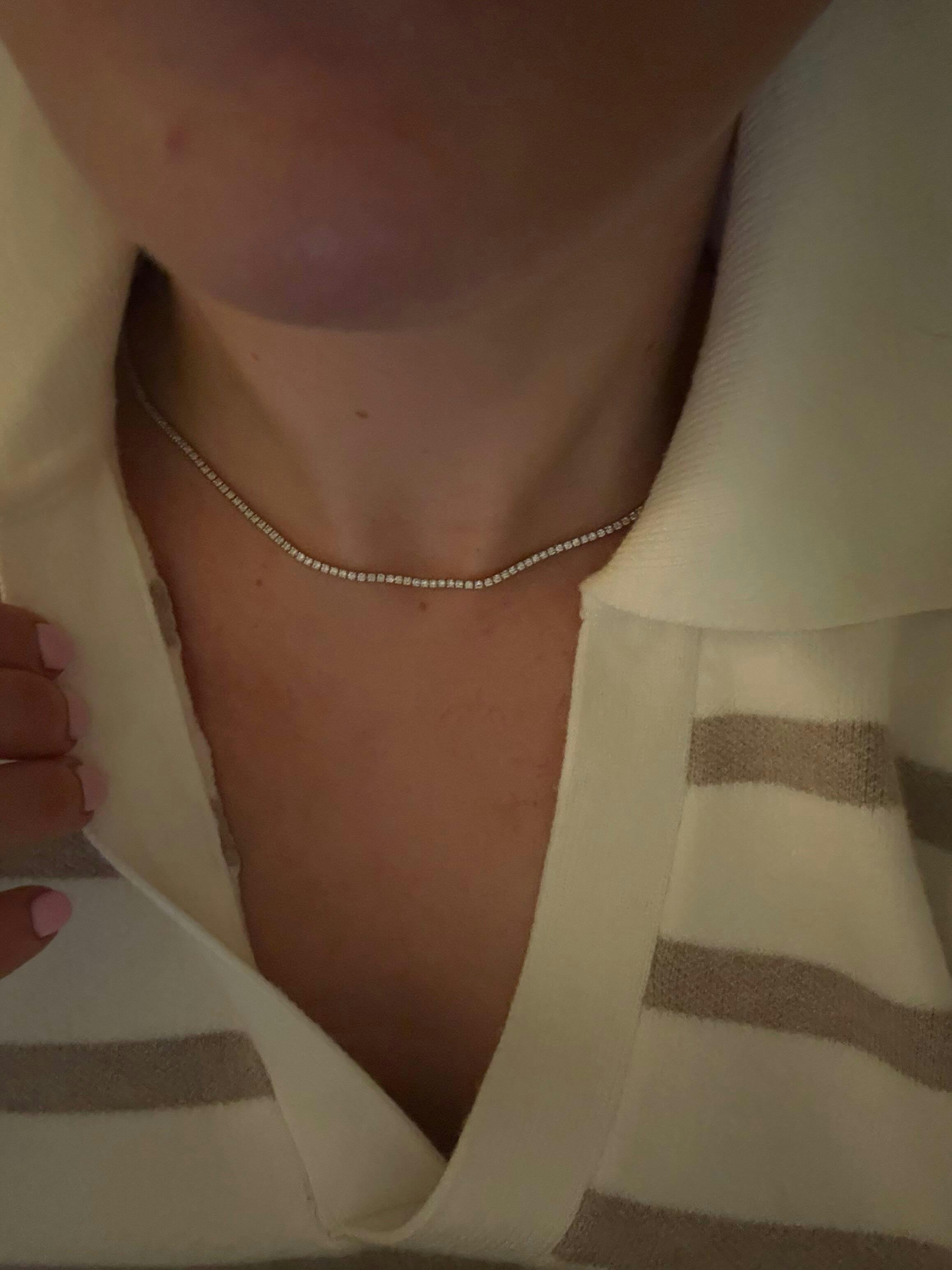 By far the best tennis necklace I’ve owned. The stones are gorgeous and just sparkle and shine. The necklace lays nice and flat and feels well made and solid for everyday wear. It’s an everyday luxury type of piece.