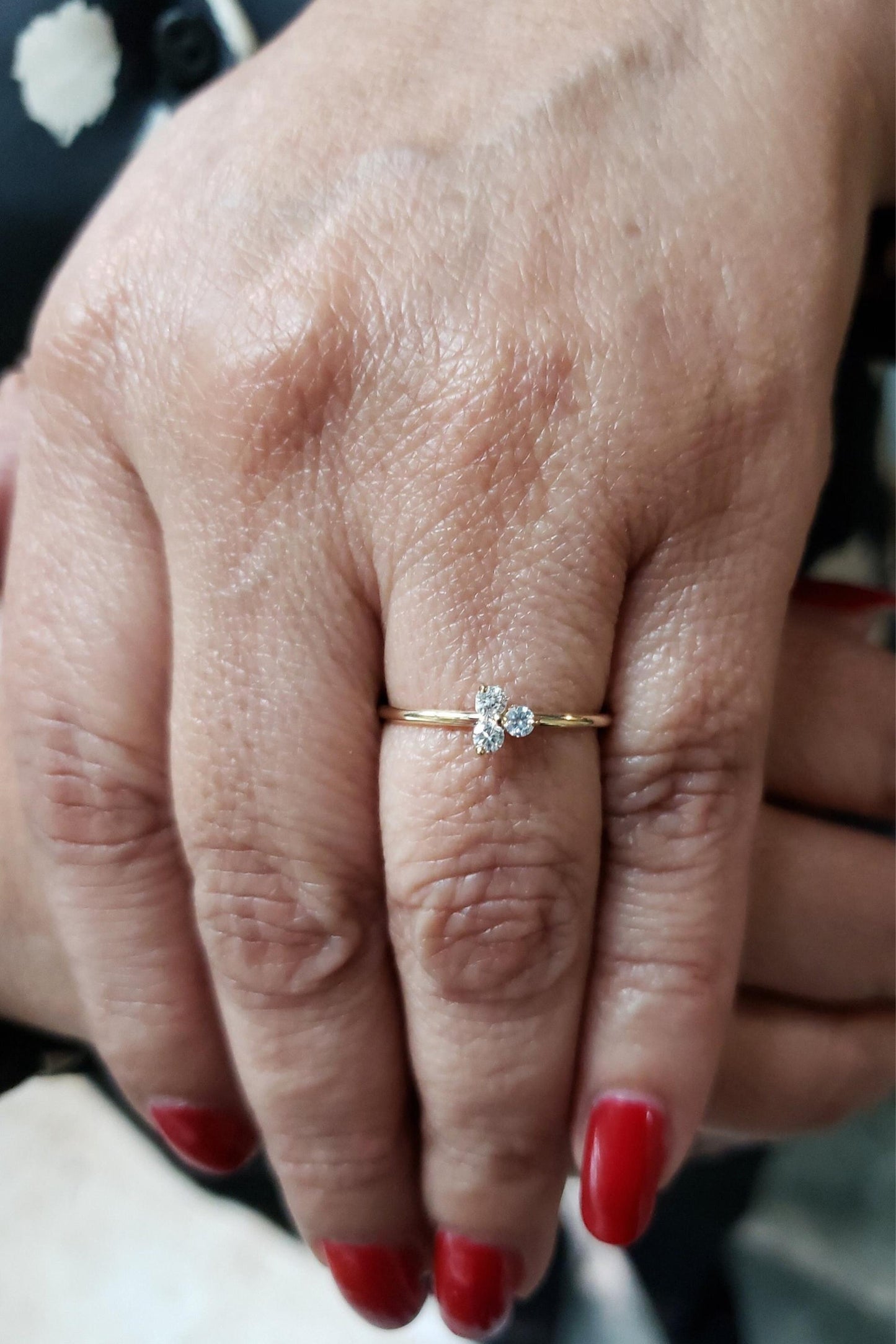 This is a beautiful design ring set with 3 diamonds. It is set in real solid 14Kt Gold. You can choose if you want 14Kt White Gold, 14Kt Yellow Gold or 14Kt Rose Gold.