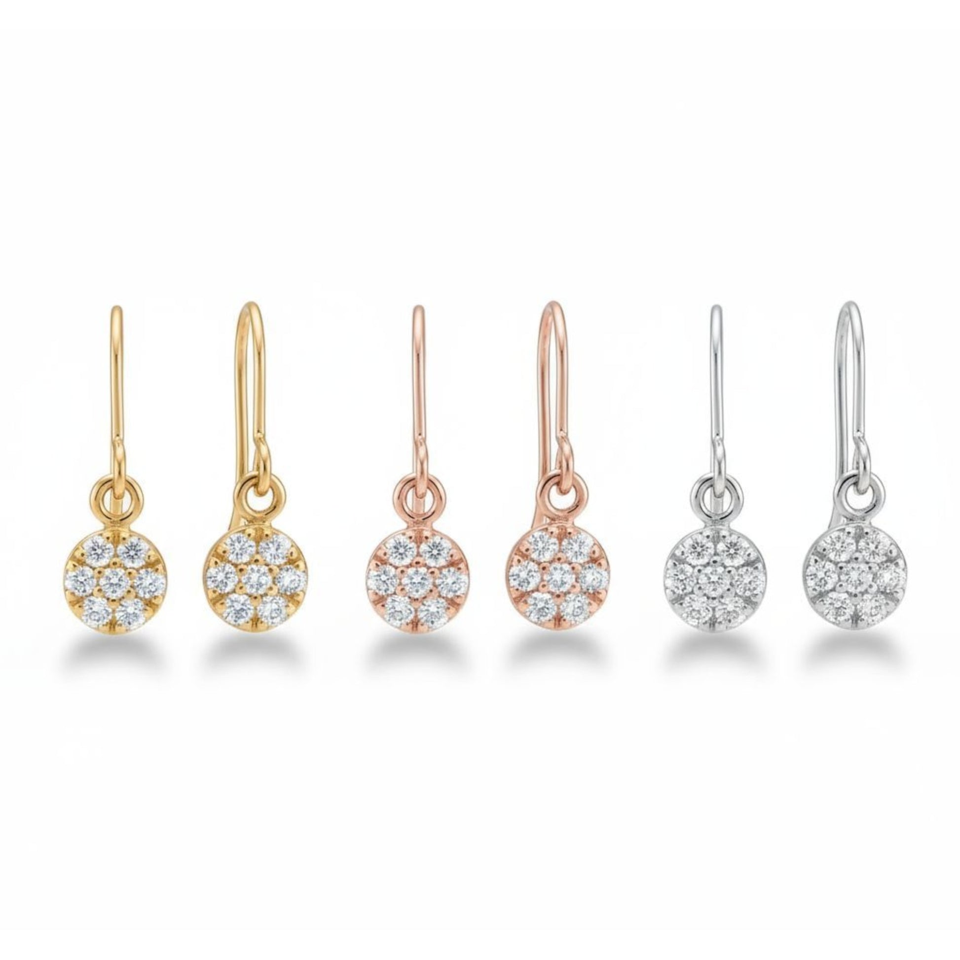 This is a beautiful diamond design earrings. It is set in real solid 14Kt Gold. You can choose if you want 14Kt White Gold, 14Kt Yellow Gold or 14Kt Rose Gold.