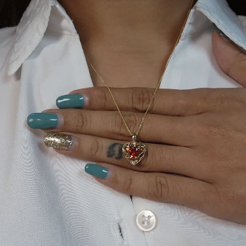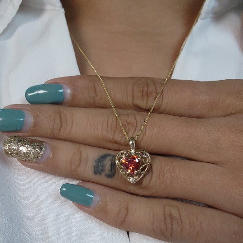 14Kt Gold Garnet & Diamond Heart LOVE ENGRAVED Pendant Necklace