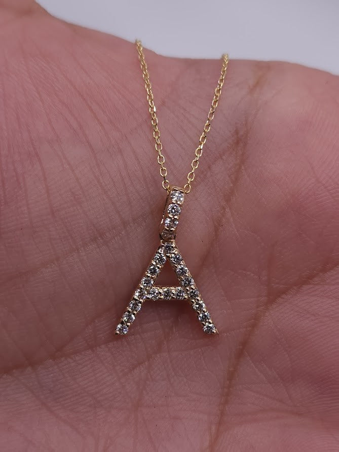 This is a beautiful initial letter diamond design pendant. It is set in real solid 14Kt Gold. You can choose if you want 14Kt White Gold, 14Kt Yellow Gold or 14Kt Rose Gold.