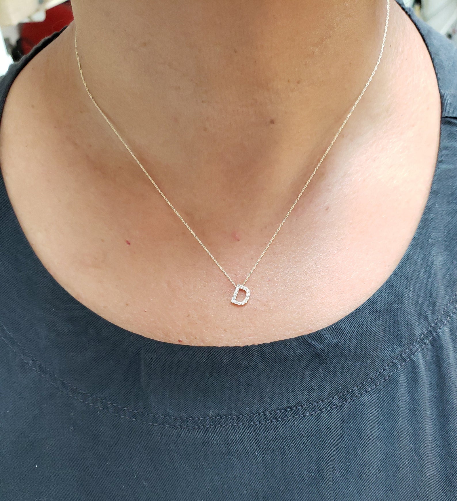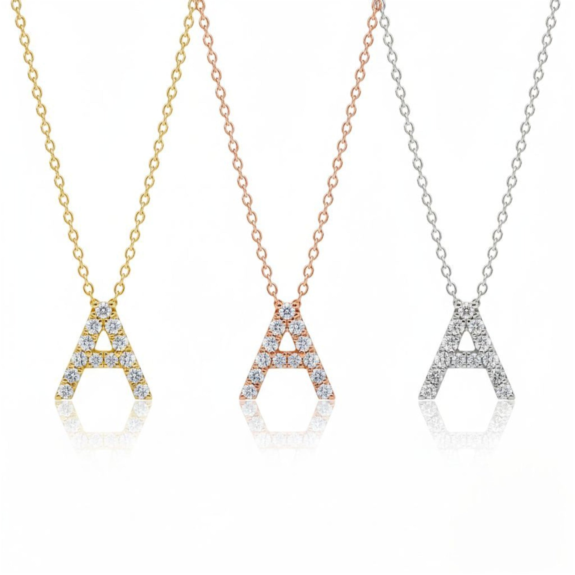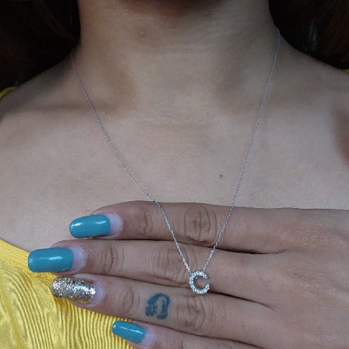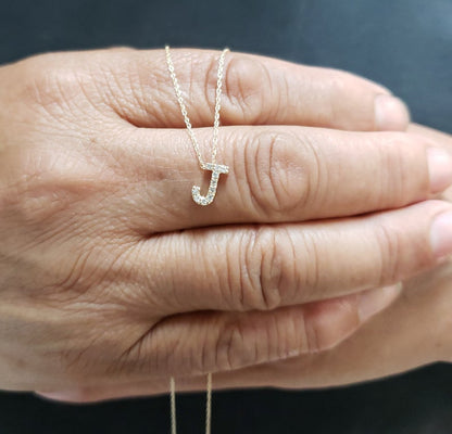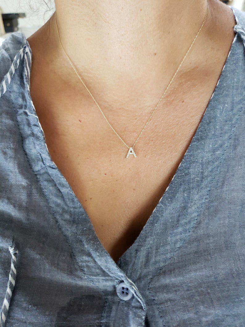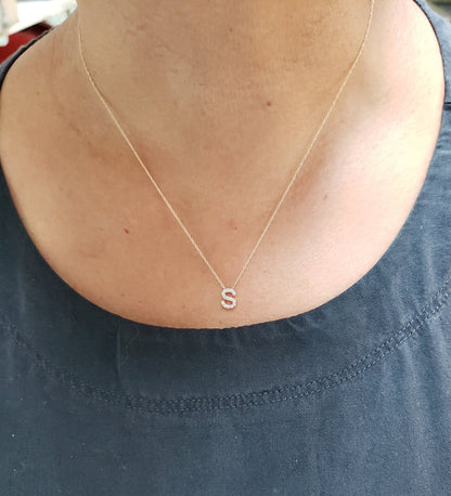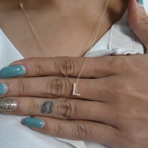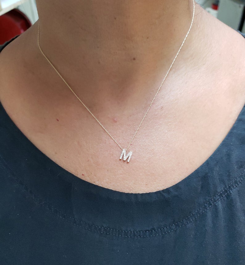 This is a beautiful initial letter diamond design necklace. It is set in real solid 14Kt Gold. The Pendant and chain are both 14Kt Gold. You can choose if you want 14Kt White Gold, 14Kt Yellow Gold or 14Kt Rose Gold.