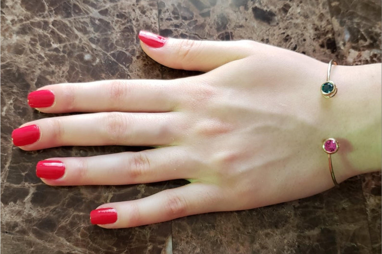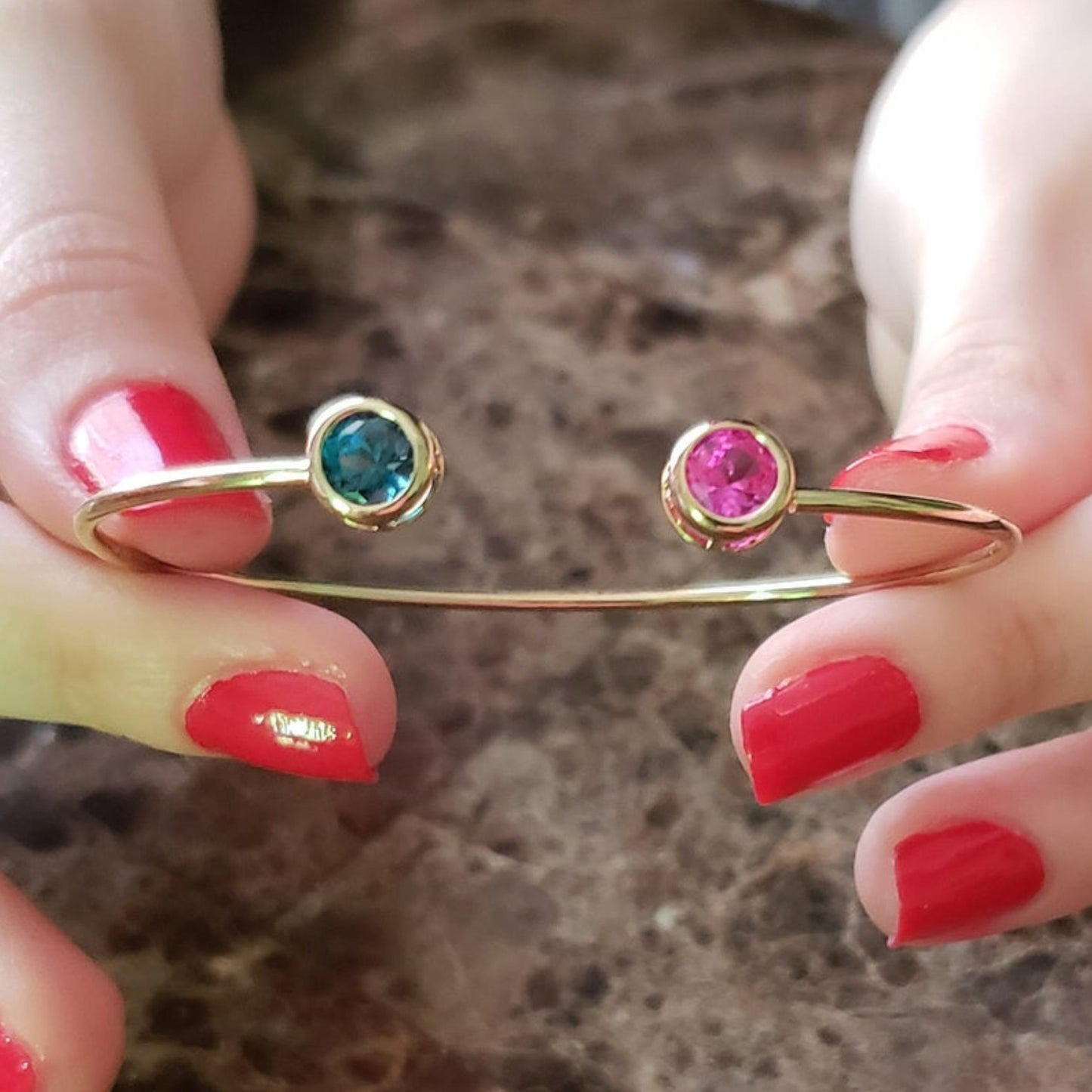 This is a beautiful round shape bezel bangle bracelet set in Solid 14Kt Gold. We have this bangle design available in all gemstones that you can see in our store. You can choose if you want it in 14Kt White Gold, 14Kt Yellow Gold or 14Kt Rose Gold.