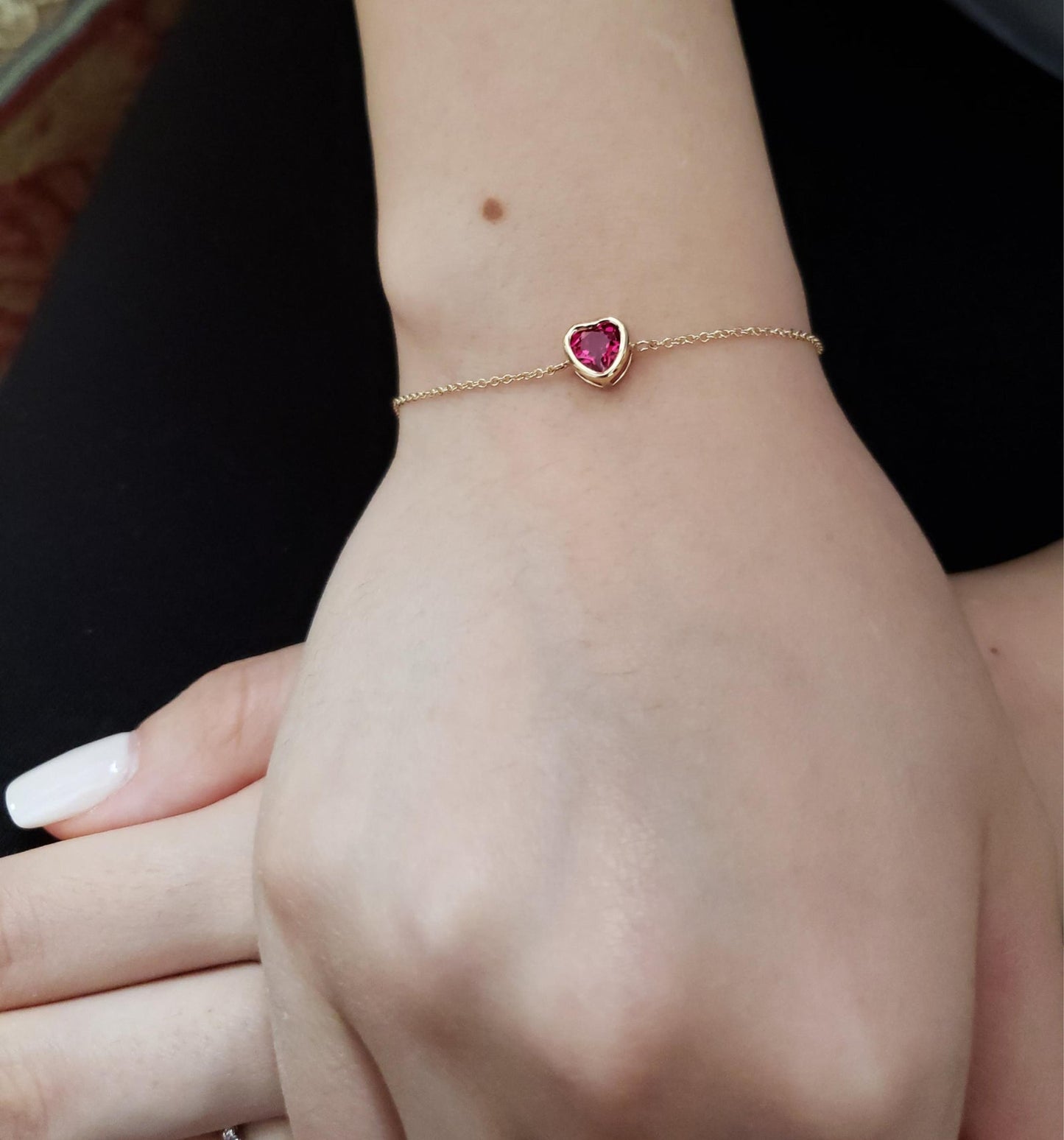 This is a beautiful heart shape bezel bracelet set in Solid 14Kt Gold. We have this design available in all gemstones that you can see in our store. You can choose if you want it in 14Kt White Gold, 14Kt Yellow Gold or 14Kt Rose Gold.