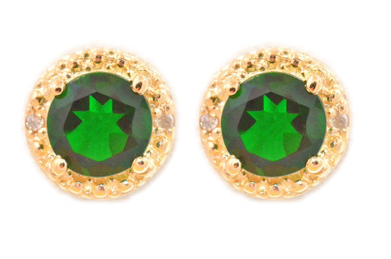 14Kt Yellow Gold Emerald & Diamond Round Stud Earrings