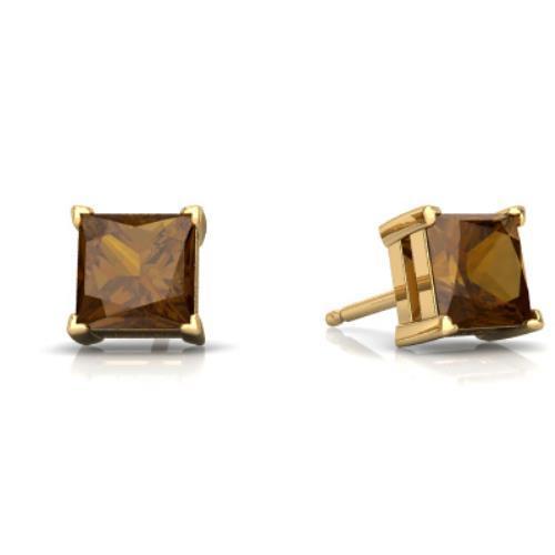 14Kt Yellow Gold Smoky Quartz Princess Cut Stud Earrings